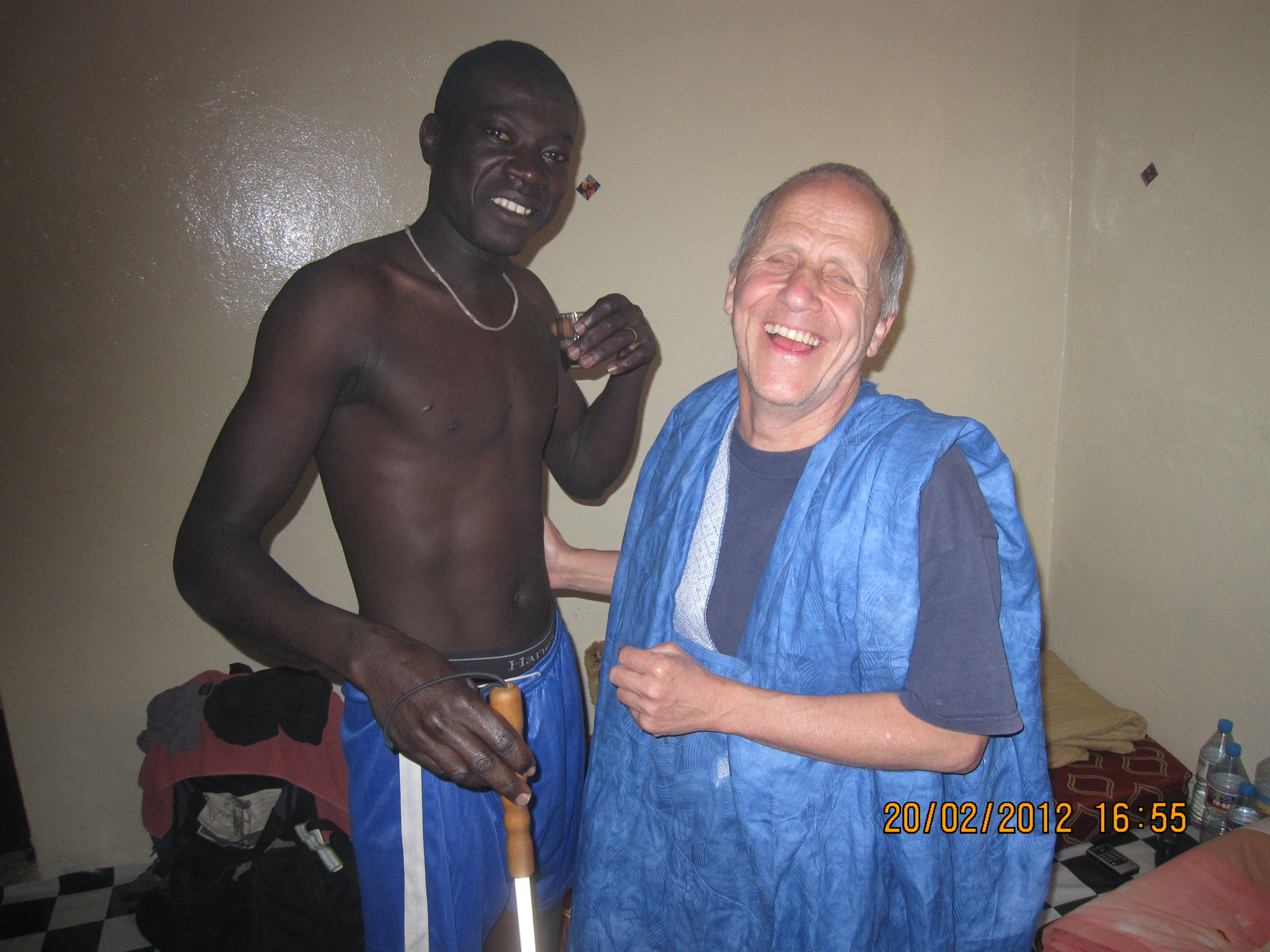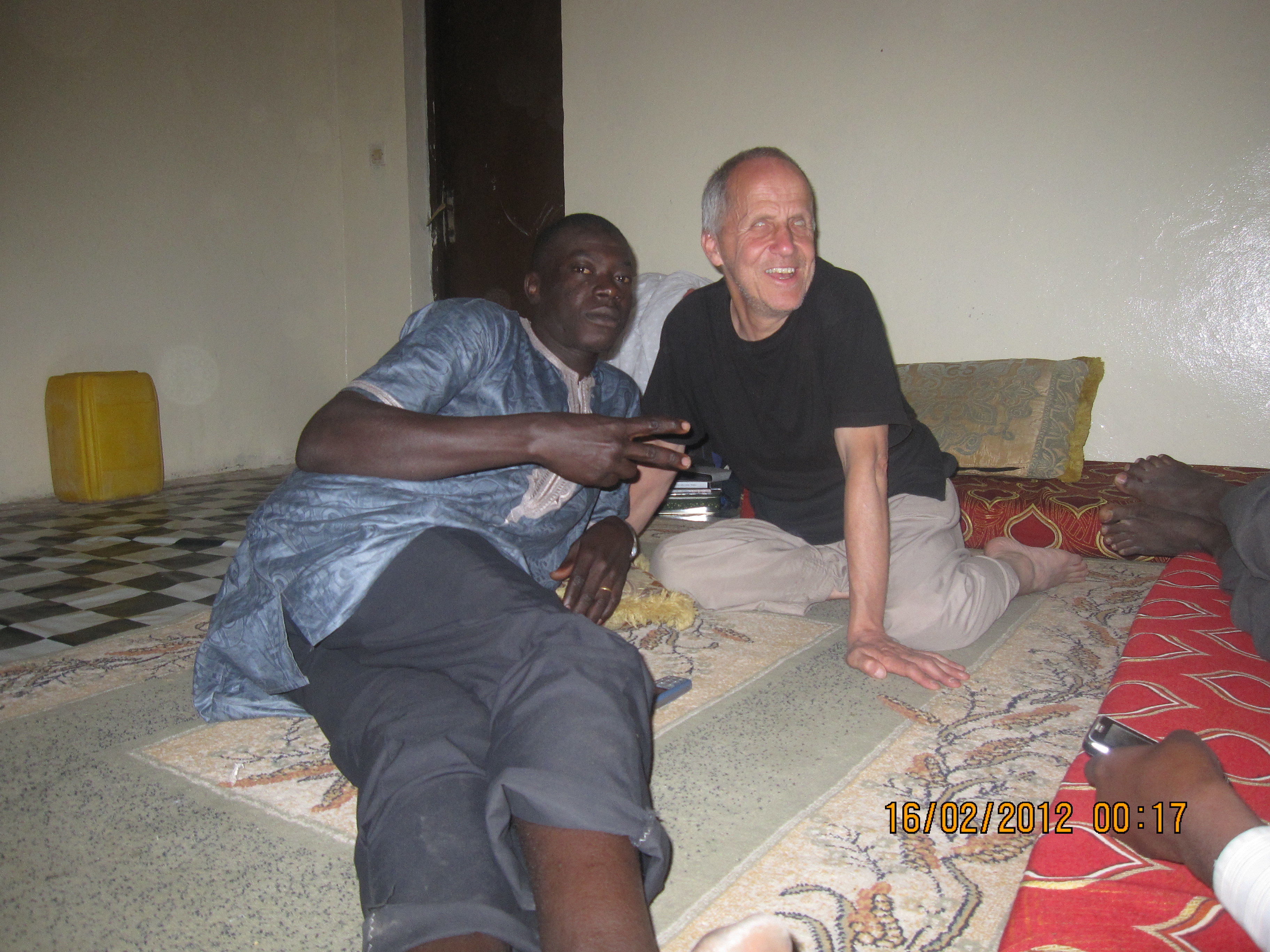 Anders als bei meinem letzten Aufenthalt in Nouakchott wohnte ich diesmal nicht im Hotel, sondern bei Ousmane und seinem Freund Amadou mitten im eher armen, dicht bevölkerten 6. quartier. Wir hausten einen Monat lang zusammen in einem Zimmer im Haus von Amadous Familie: drei Matratzen an den Wänden um einen Teppich, auf dem zum Essen jeweils ein Tuch ausgebreitet wurde. In einer Ecke auf einem Tablett ein Gaskocher zum Tee machen und zwei oder drei Becher und ein paar andere Utensilien. Gegenüber der Tür zwei schmale Fenster auf eine Gasse, wie alle Seitenstrassen hier weder gepflastert noch geteert, sondern blosser Sand. An unser Zimmer anstossend "la douche", ein Raum mit einfachem Zementfussboden und, etwas erhöht im hintern Teil ein in den Boden eingelassenes Kauerklo - Tschinkeschissi, wie wir vor 50 Jahren in der Schweiz gesagt haben.