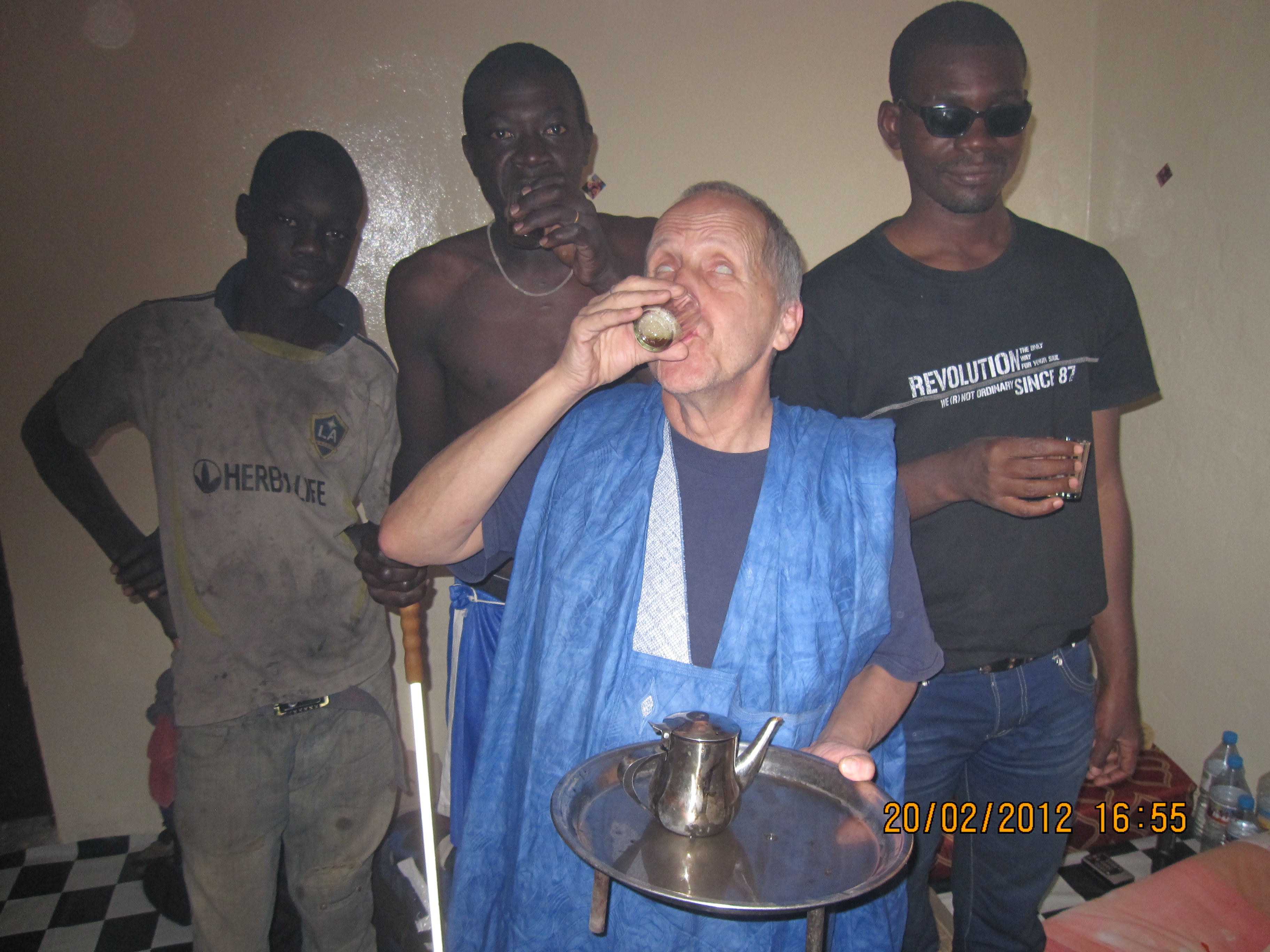 Während der vier Wochen in unserer Junggesellenbude erlebte ich sehr viel mauretanischen Alltag: ich lernte Ousmanes und Amadous Freundeskreis kennen; ich trank viel Tee - man trinkt ihn dort aus kleinen Gläsern, die man laut schlürfend in einem Zug leert, nicht gemütlich und langsam aus grossen Gläsern wie in Marokko. Dabei stört das Schlürfen niemanden. Ja es ist geradezu ein Muss! In den Tee zu pusten, um ihn auf diese Weise abzukühlen, ist dagegen äusserst unschicklich. Der Prophet habe im Koran davor gewarnt, sagen die einen. Andere wissen davon nichts. Doch dass man weder auf sein Essen, noch in seinen Tee pustet ist klar! - Andere Länder, andere Sitten!